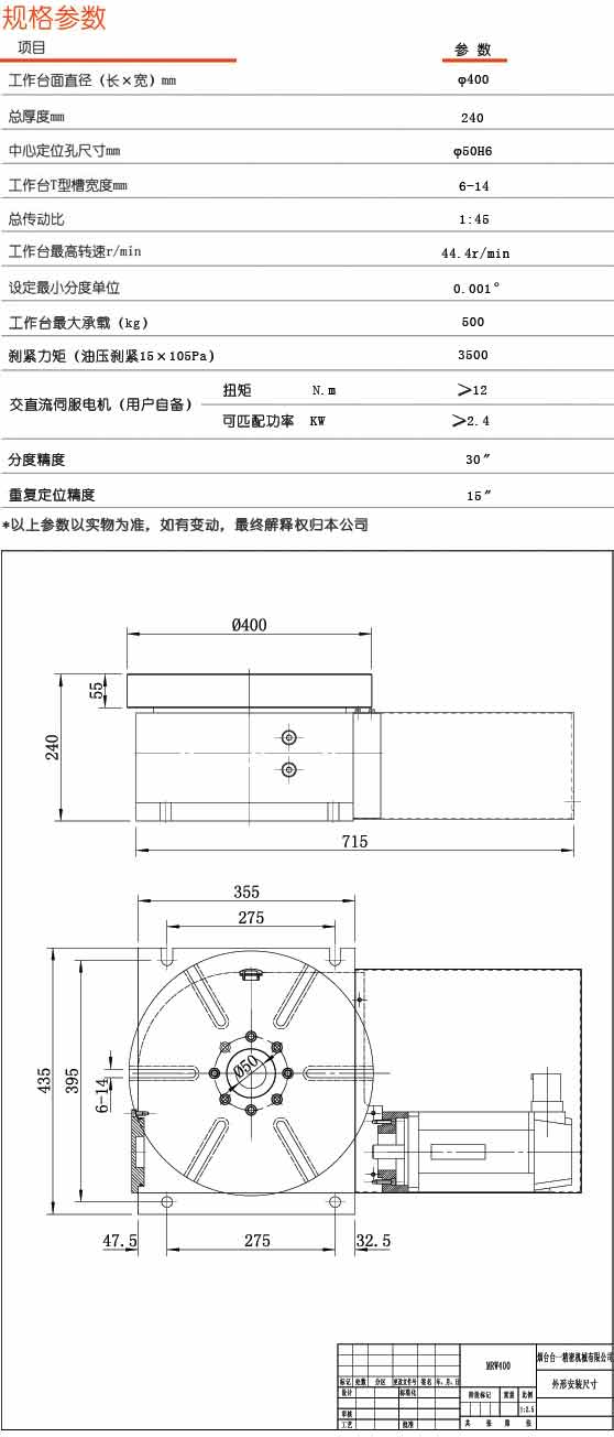 它有兩個(gè)相互垂直的定位面,而且裝有定位鍵,可方便地進(jìn)行臥式安裝。工件可由主軸孔定心,也可裝夾在工作臺(tái)的T形槽內(nèi)。工作臺(tái)可以完成任意角度分度和連續(xù)回轉(zhuǎn)進(jìn)給運(yùn)動(dòng)。工作臺(tái)的回 轉(zhuǎn)由直流伺服電動(dòng)機(jī)驅(qū)動(dòng),其尾部裝有檢測(cè)用編碼器,可實(shí)現(xiàn)半 閉環(huán)控制